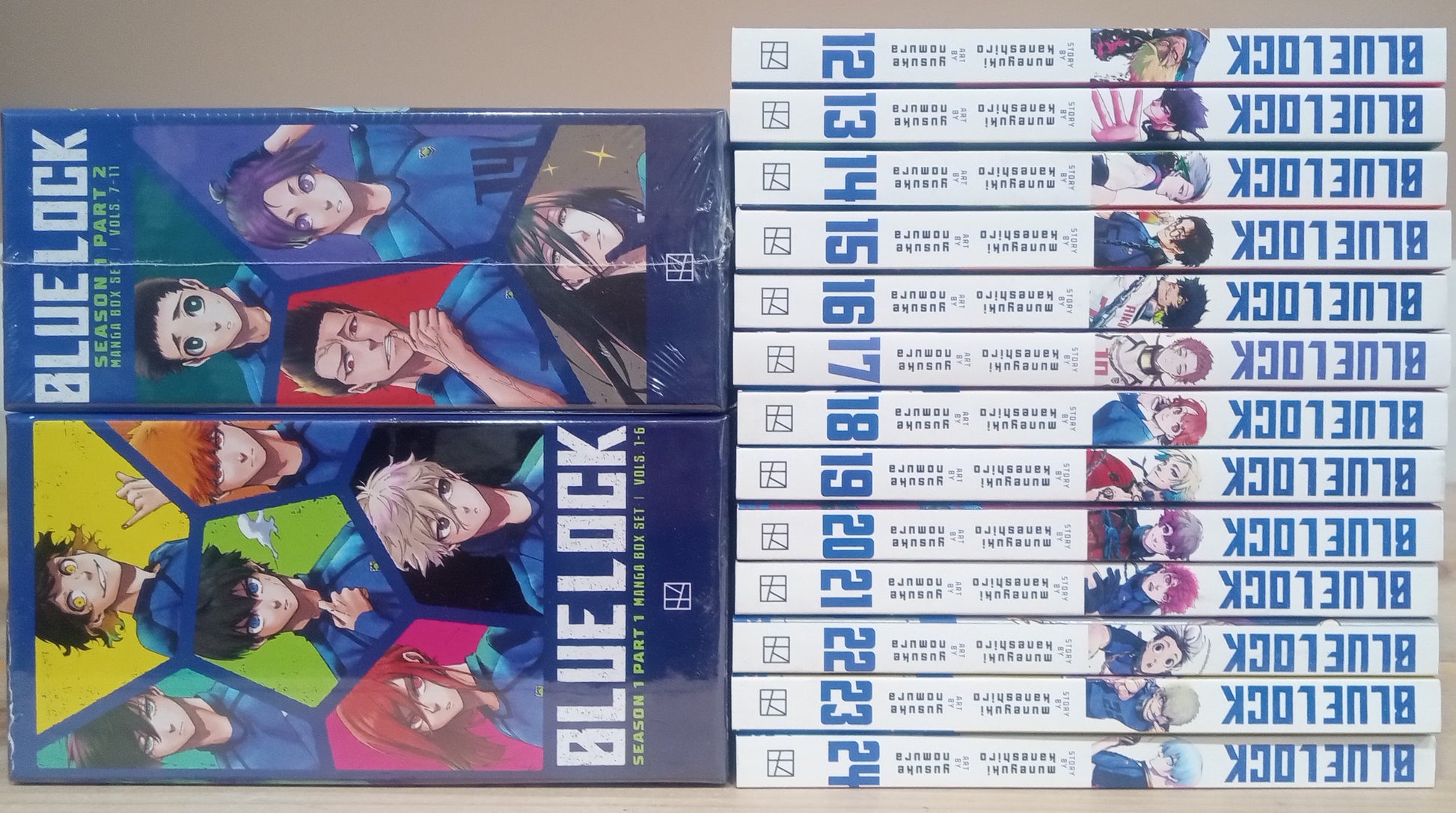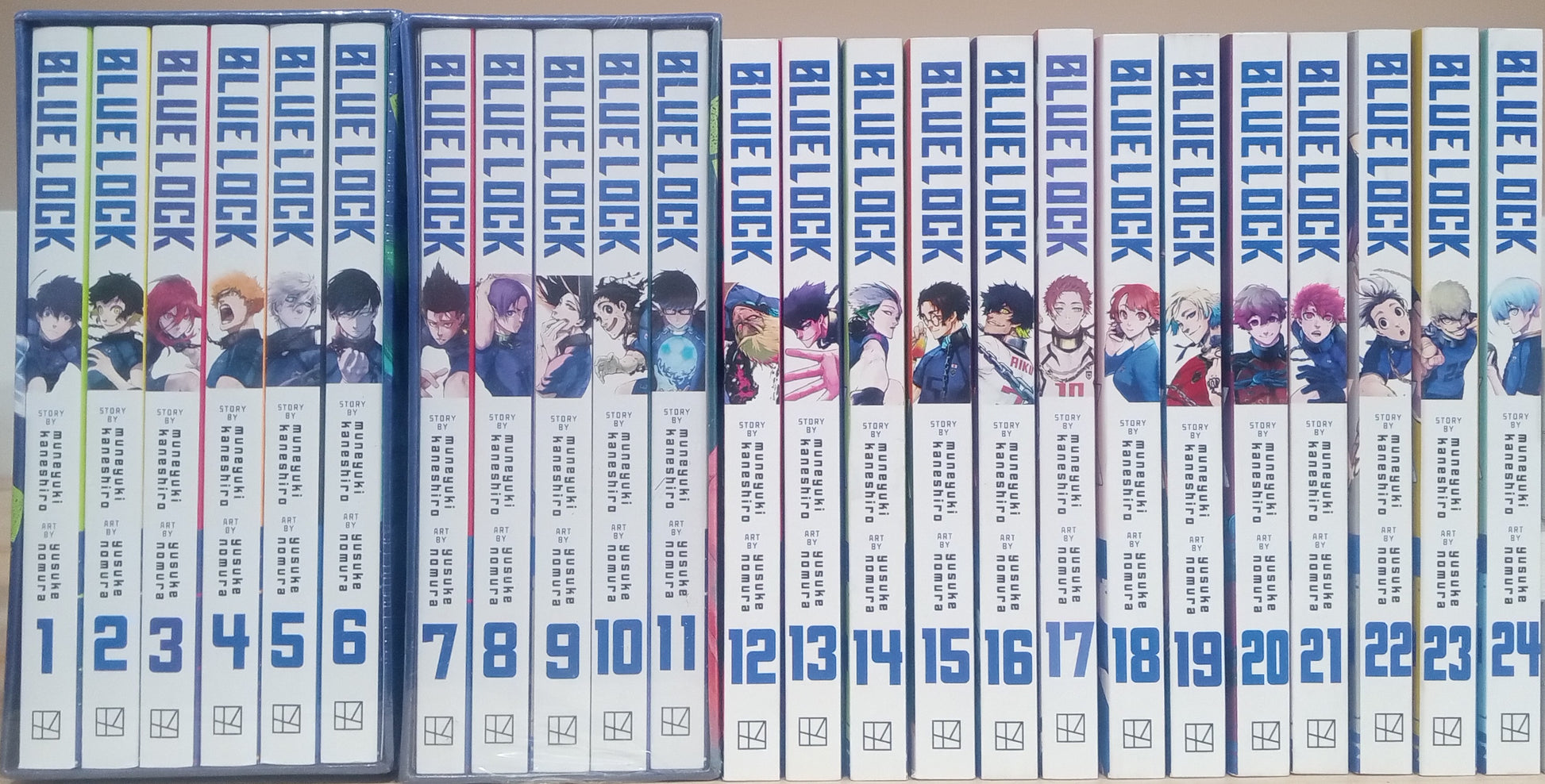 Contains 24 books, (all books in the "Blue Lock" series up-to-date), Volumes 1-6 and 7-11 are bundled in Box Set #1 & 2 of the "Blue Lock" series with their respective posters included.